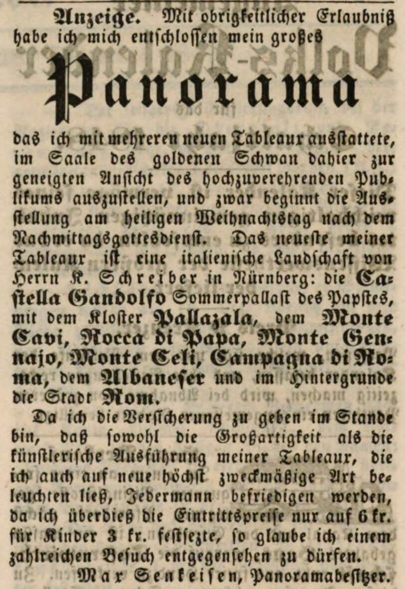 | Beschreibung | Zeitungsanzeige des Panorama-Besitzers Max Senkeisen, Dezember 1847 | ||