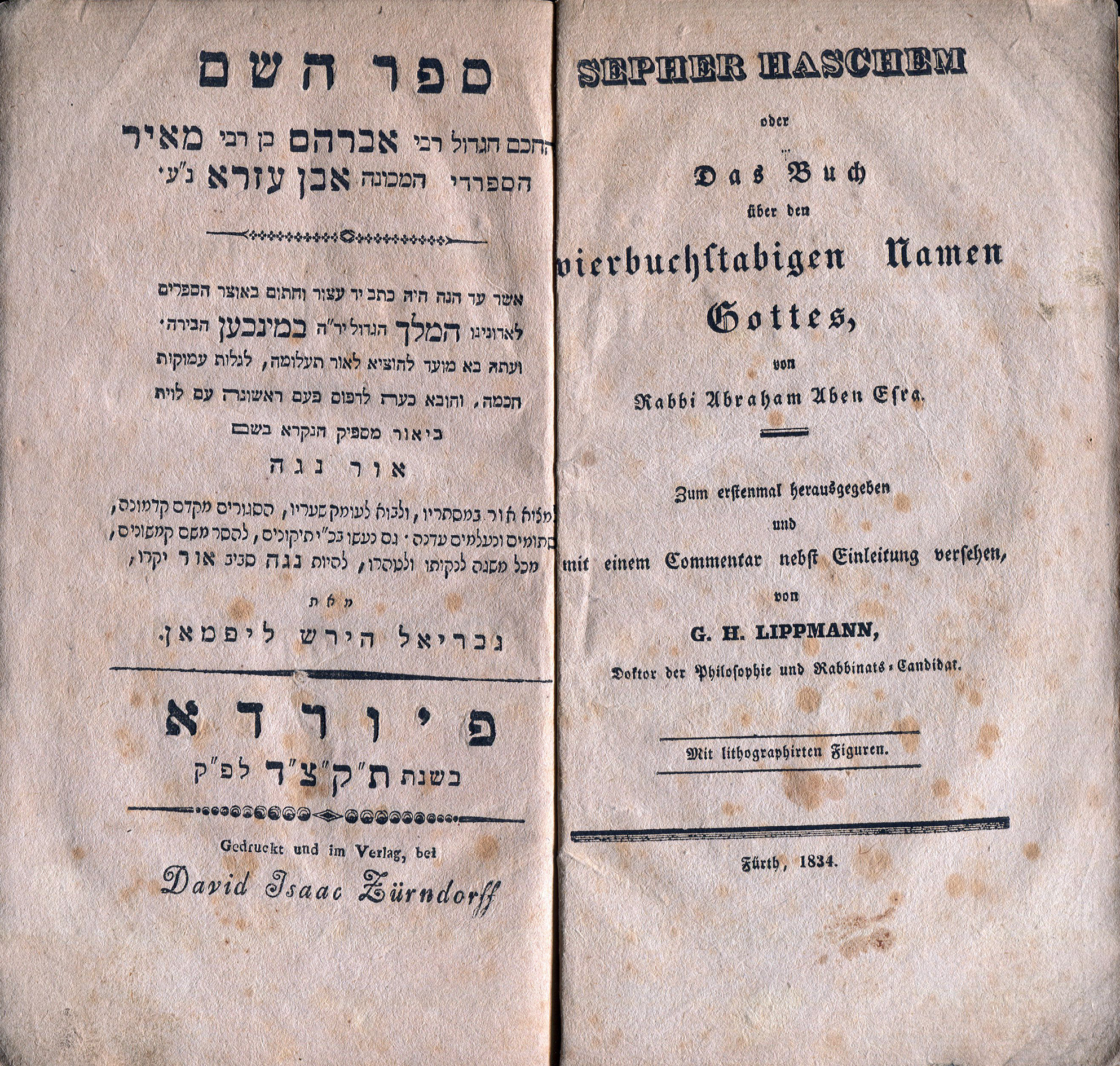 | Dateiinfo (Bild-Unterschrift und Info-Box, automatisch erstellt) | Titelblatt: Sepher Haschem, 1834 Urheber: G. H. Lippmann, Isaac David Zürndorfer, Abraham Iben Esra<br><br>Lizenz: CC BY-SA 3.0 | ||