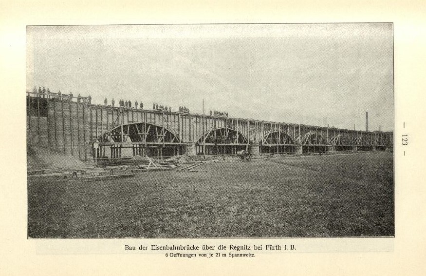 | Dateiinfo (Bild-Unterschrift und Info-Box, automatisch erstellt) | "Bau der Eisenbahnbrücke über die Regnitz bei Fürth i. B. 6 Oeffnungen von je 21 m Spannweite.", ... "Bau der Eisenbahnbrücke über die Regnitz bei Fürth i. B. 6 Oeffnungen von je 21 m Spannweite.", 1902<br><br>Lizenz: PDM | ||