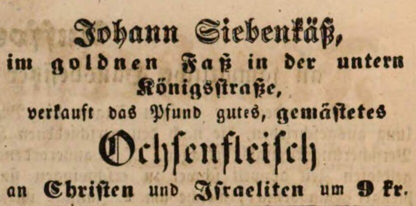 | Dateiinfo (Bild-Unterschrift und Info-Box, automatisch erstellt) | Zeitungsanzeige von Johann Siebenkäß, Januar 1849 Lizenz: NoC-NC 1.0 | ||