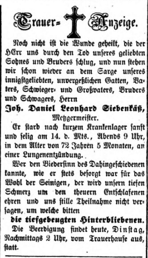 | Beschreibung | Traueranzeige für Joh. Daniel Leonh. Siebenkäß, Juni 1856 | ||