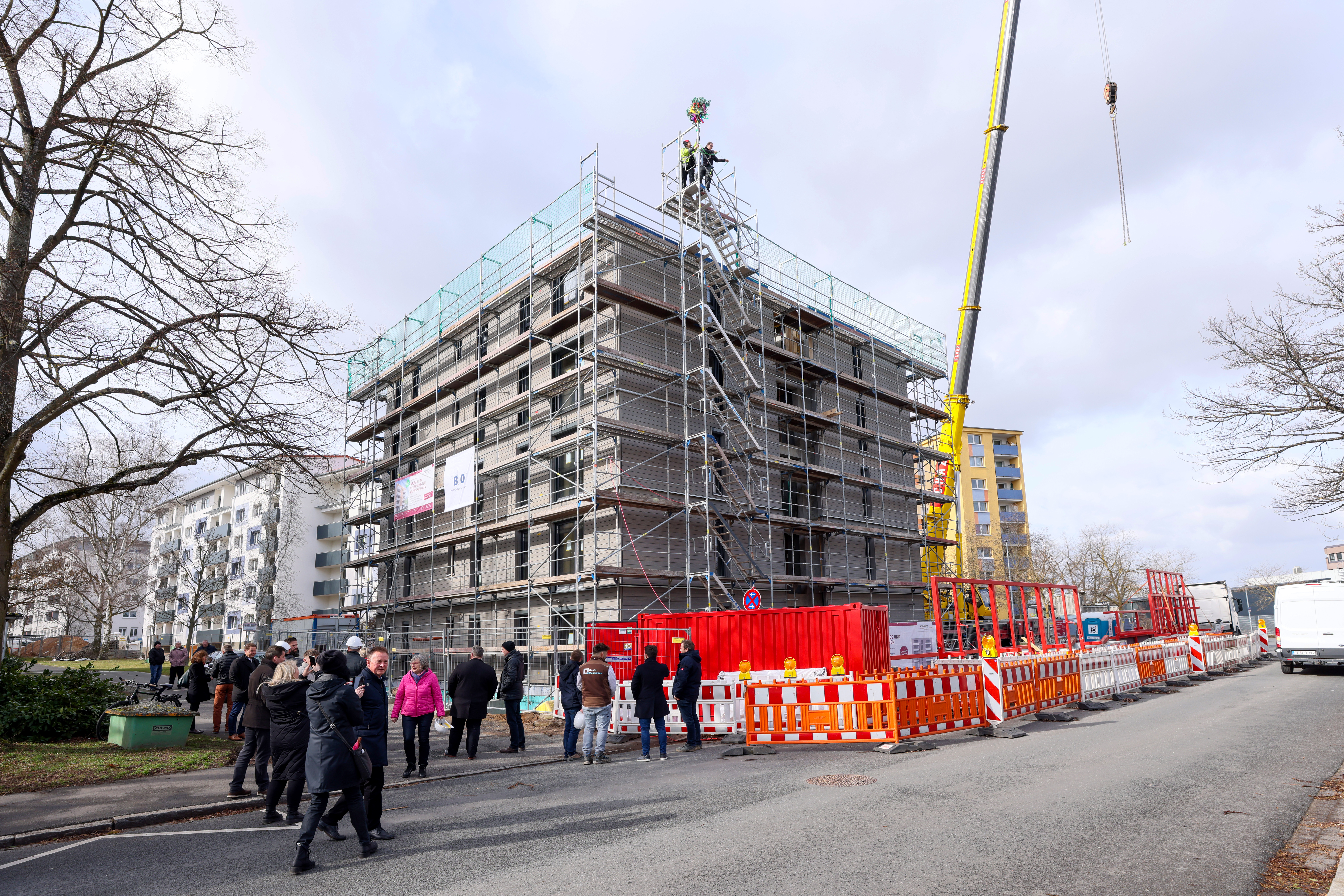 | Beschreibung | Richtfest für das erste Holzhybridhaus in Fürth in der Siemensstraße 24 errichtet von der WBG Fürth, Feb. 2022 | ||
