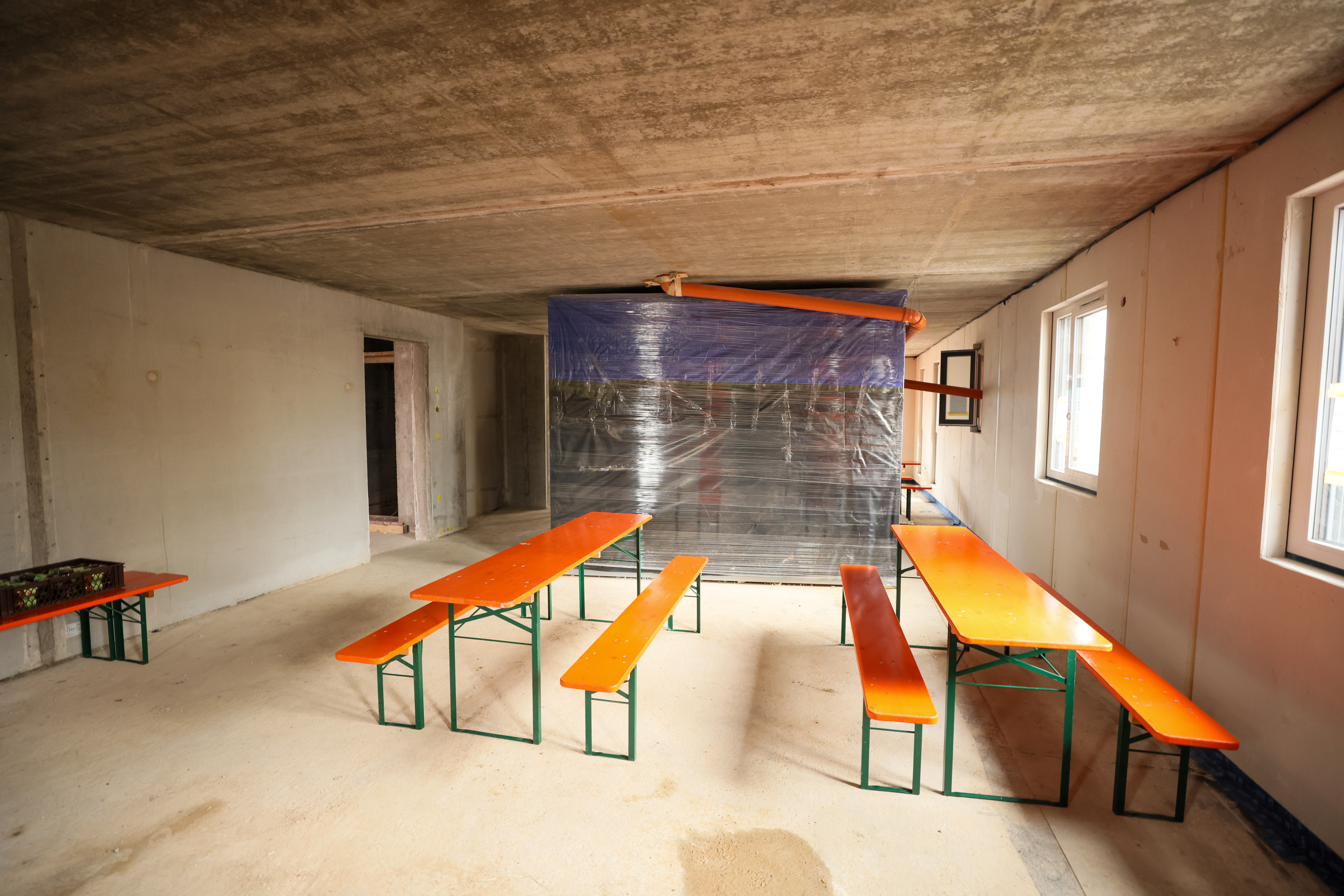 | Beschreibung | Richtfest für das erste Holzhybridhaus in Fürth in der Siemensstraße 24 errichtet von der WBG Fürth - in der Folie eingewickelt das Bad, dass noch individuell verschoben werden kann, Feb. 2022 | ||
