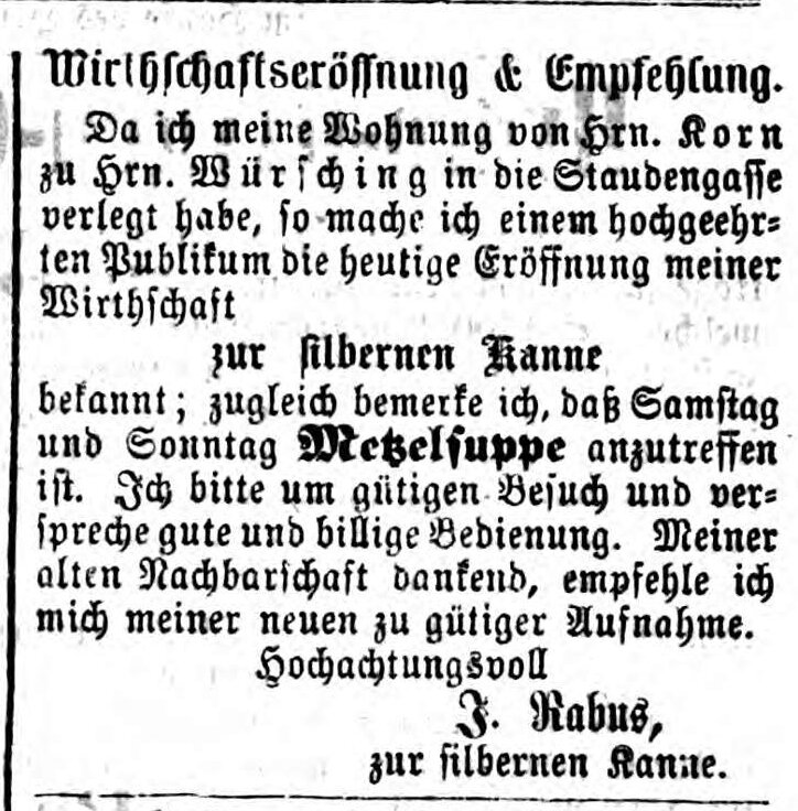| Beschreibung | Wirtschaftseröffnung J. Rabus, Fürther Tagblatt vom 11. Februar 1865 | ||