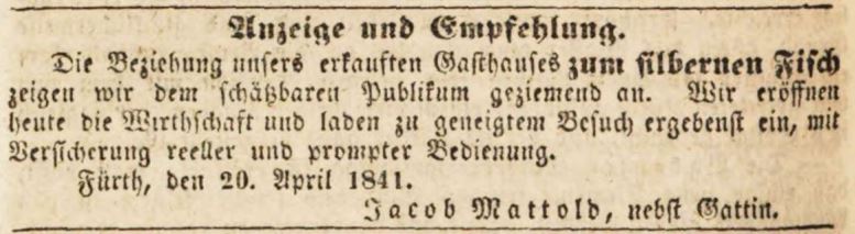 | Beschreibung | Werbeannonce für die Gaststätte zum silbernen Fisch, April 1841 | ||