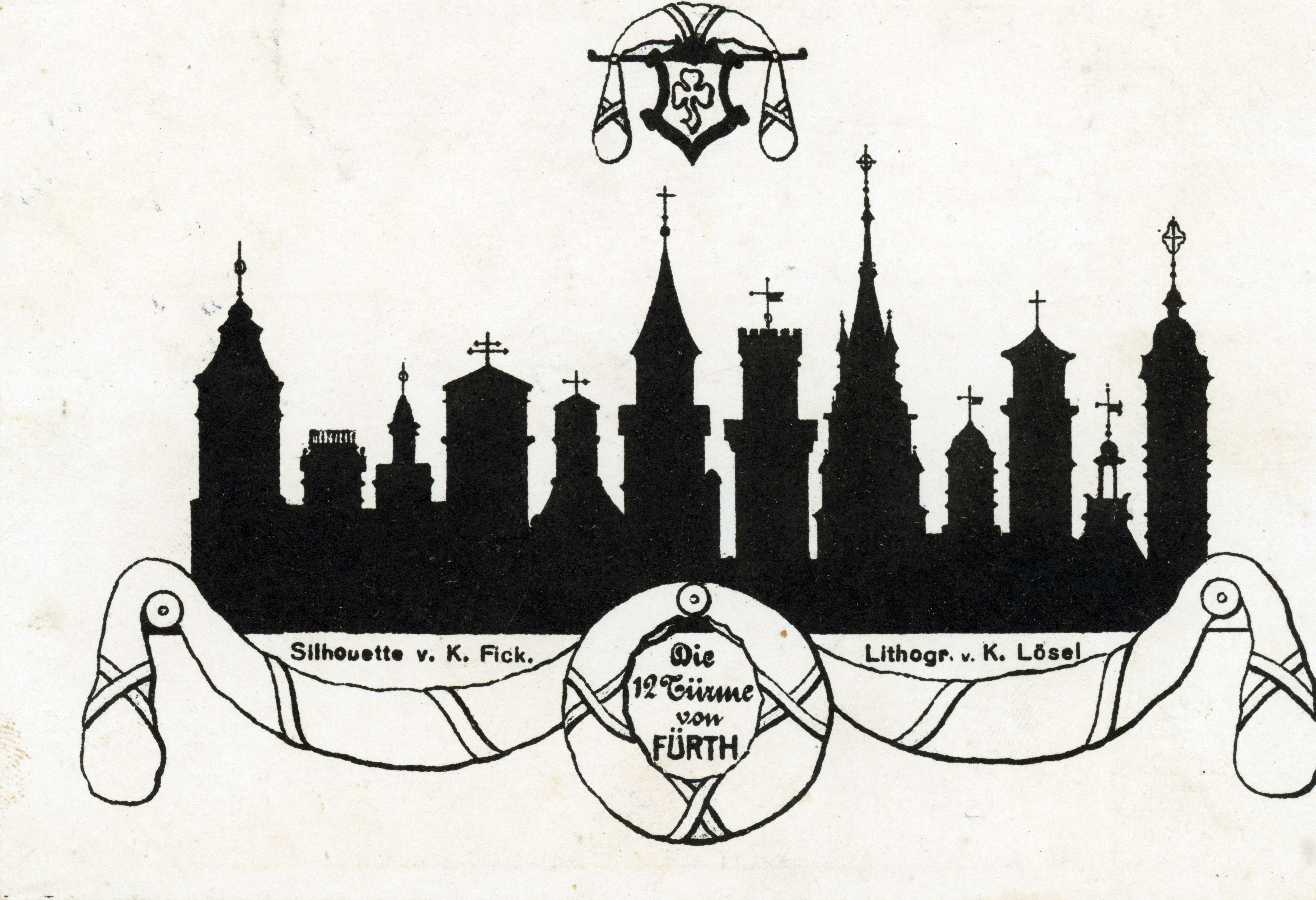 | Beschreibung | Ansichtskarte mit den 12 Türmen aus der Stadtsilhouette in Fürth, ca. 1900 | ||