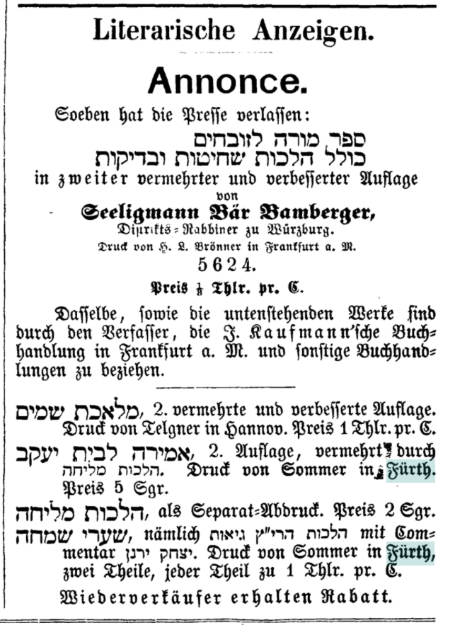 | Beschreibung | Inserat J. Sommer in "Der Israelit", 6.4.1864 | ||