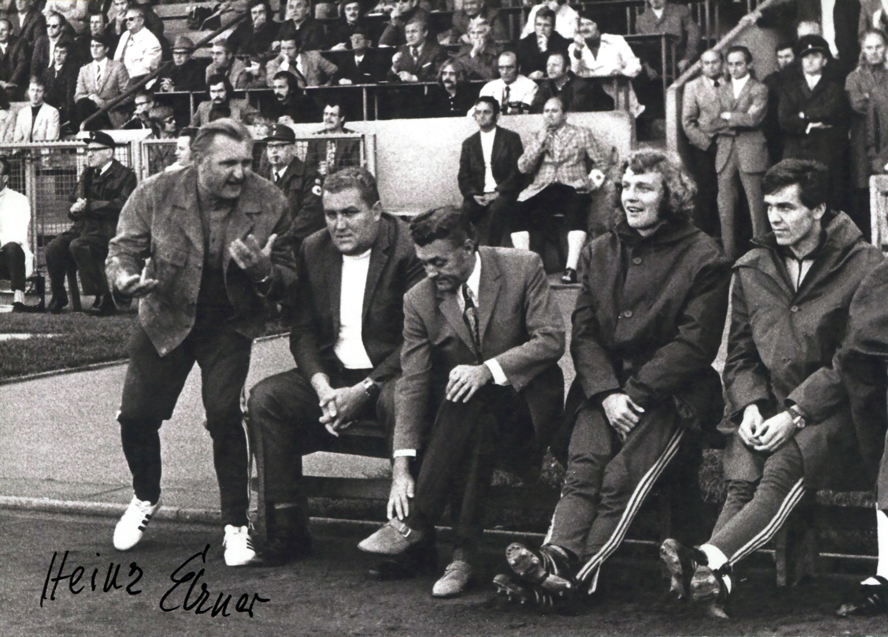 | Beschreibung | Trainerbank im Sportpark Ronhof, links Trainer Heinz Elzner mit Unterschrift, ca. 1972/73 | ||
