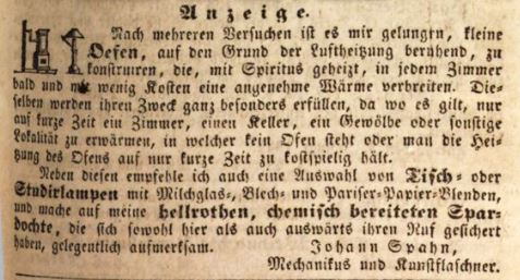 | Beschreibung | Werbeannonce des Kunstflaschners Johann Spahn, Januar 1842 | ||