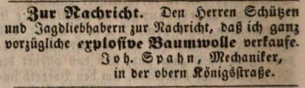 | Beschreibung | Der Mecahniker Johann Spahn wirbt für seine "explosive Baumwolle", Oktober 1846 | ||