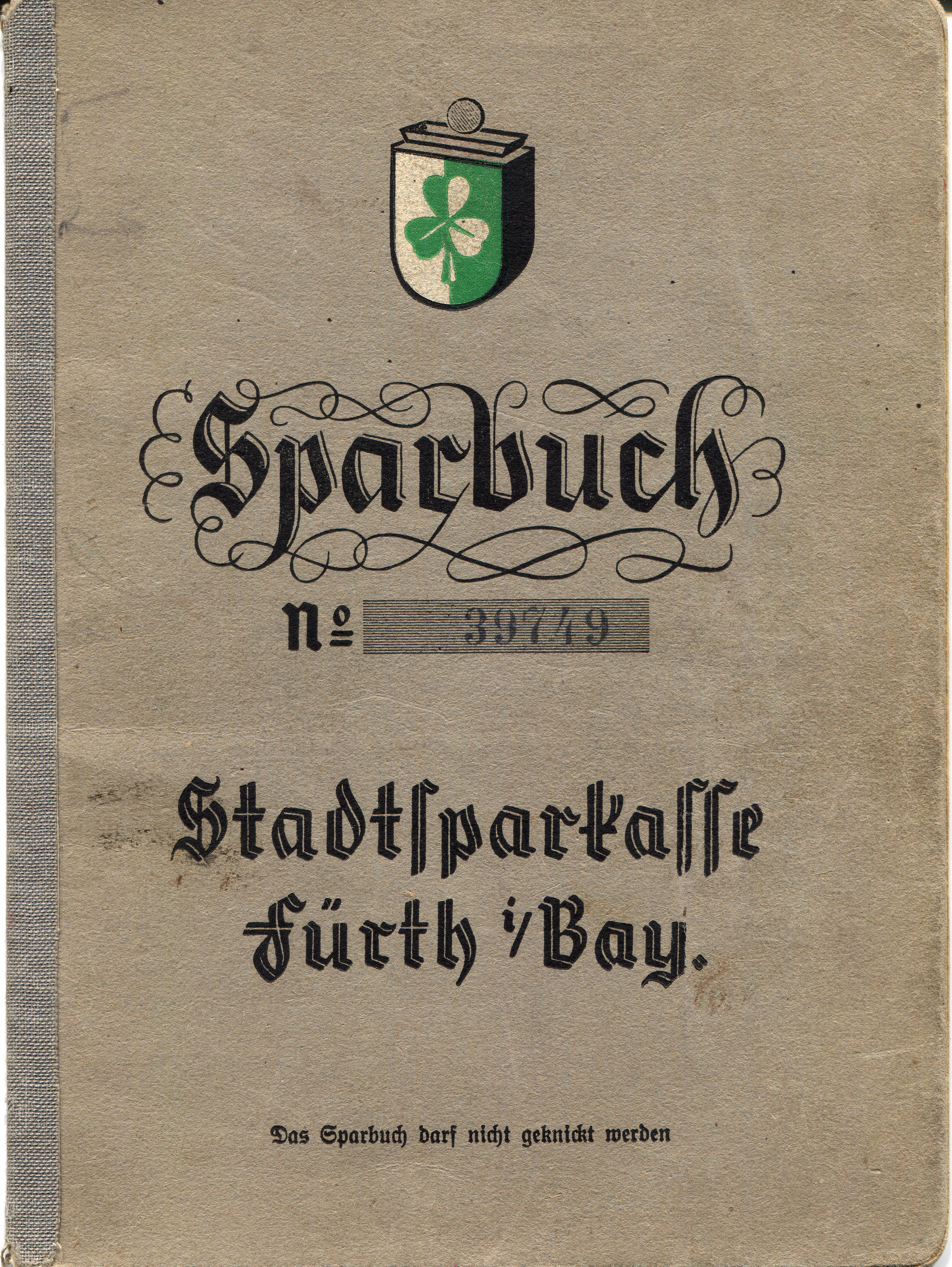 | Beschreibung | Titelseite Sparbuch der Sparkasse Fürth, genutzt 1940 | ||