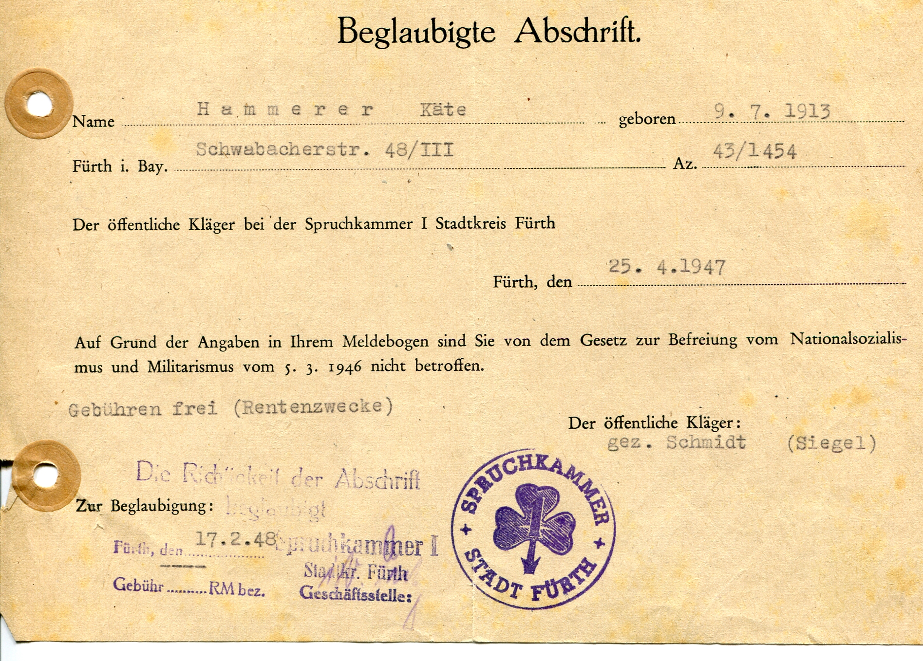 | Beschreibung | Entscheid "nicht betroffen" der Spruchkammer Fürth 1947 zur "Entnazifizierung" - beglaubigte Abschrift | ||