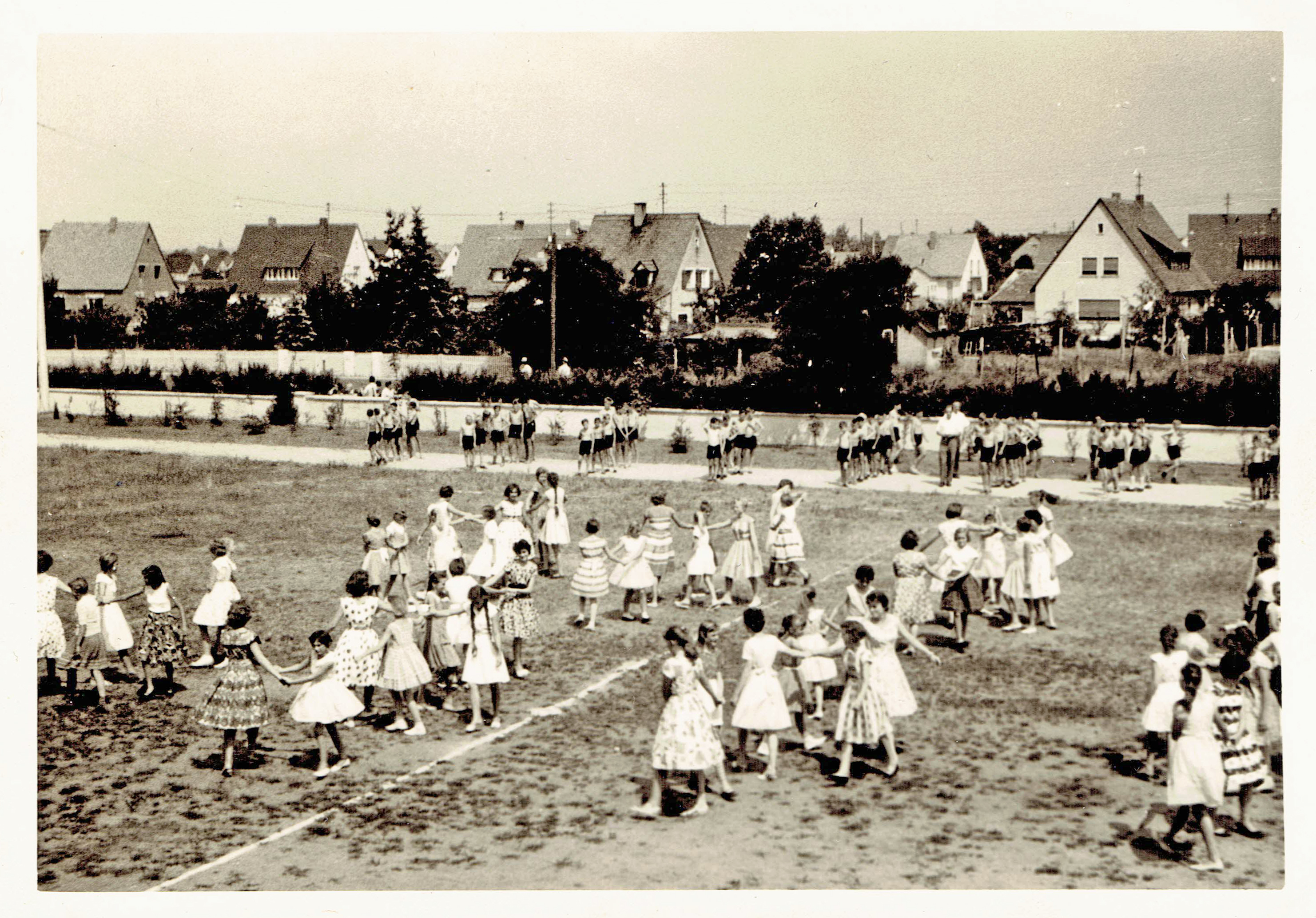 | Beschreibung | Schulsportfest an der alten Schule in Stadeln, 1960 | ||