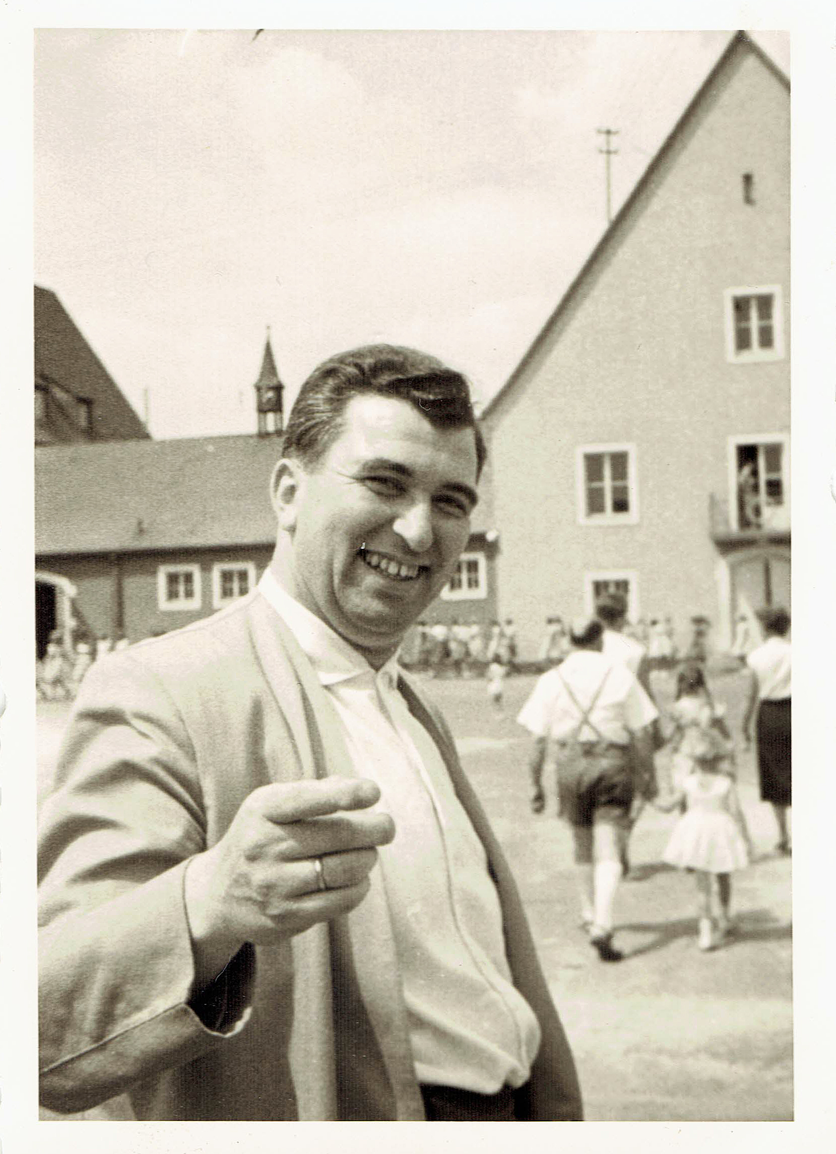 | Beschreibung | Pfarrer Theodor Vogel beim Schulsportfest an der alten Schule in Stadeln, 1960 | ||