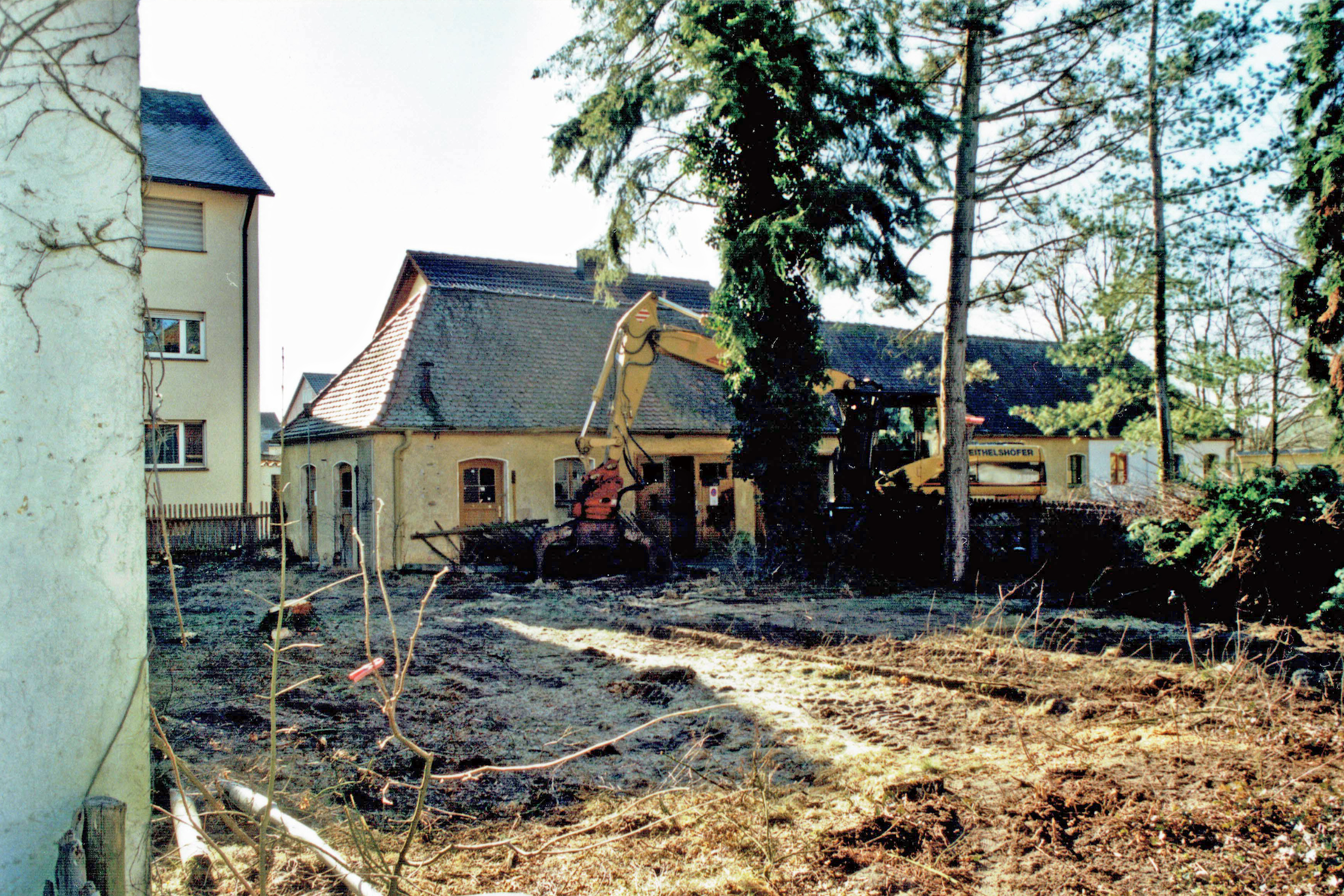 | Beschreibung | Das ehemalige Lehrerwohnhaus wird abgerissen, mit Nebengebäude, 2008. Heute steht hier das Gebäude Karl-Hauptmannl-Straße 1. | ||