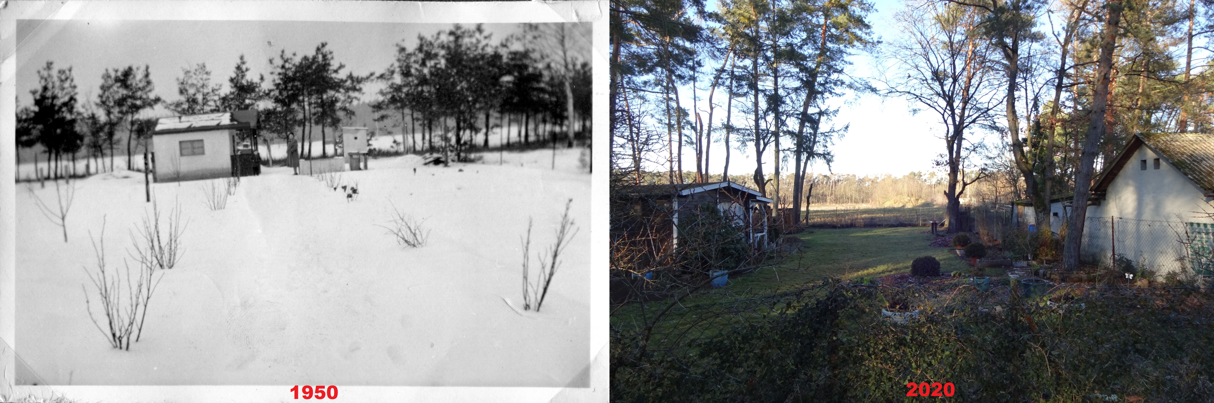 gleiches Motiv an der Stadelner Hard Blickrichtung Kronacher Wald nach 70 Jahren. Das Grundstück wurde 1952 komplett abgeräumt und lag Jahrzehnte brach. Vergleichspunkt der Zaun rechts.