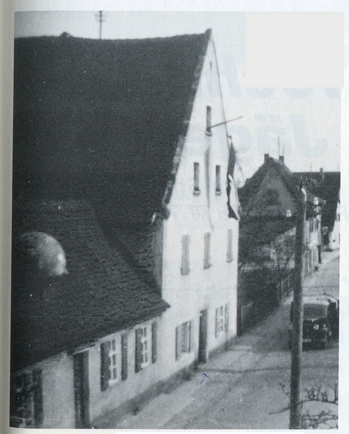 Stadelner Hauptstraße (links das heutige Haus Nr. 92) ca. 1936 mit Hakenkreuzbeflaggung am ehemaligen Gasthaus Zum Wilden Mann (Stadeln) und damaligen Postamt gegenüber vom Gästehaus Kalb. Man sieht links das Ulrichs-Gasthaus Zur Linde. Davor hieß es Zum Wilden Mann und davor Schenkstatt zur Straße. 1962 wurde es wegen des Ausbaus der Staatsstraße 2242 abgerissen.