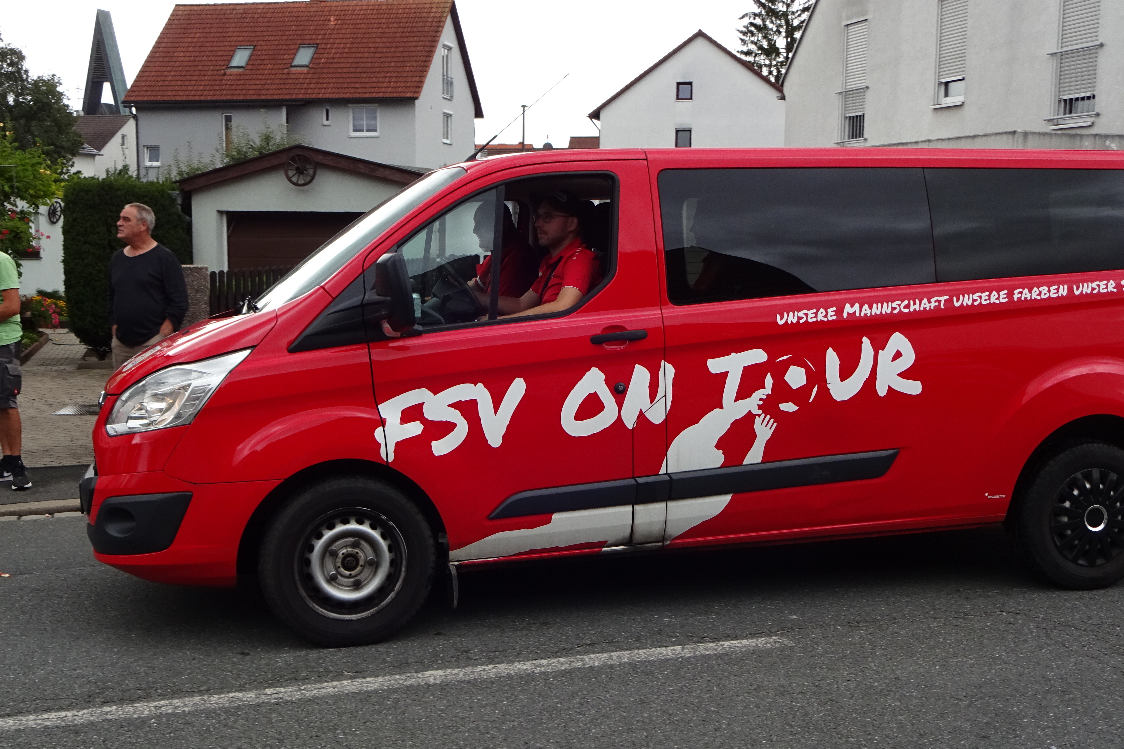 | Beschreibung | Mannschafts Bus vom FSV Stadeln mit Slogan "FSV on Tour unsere Mannschaft - unsere Farben - unser Stolz", Stadelner Kärwa, August 2023 | ||
