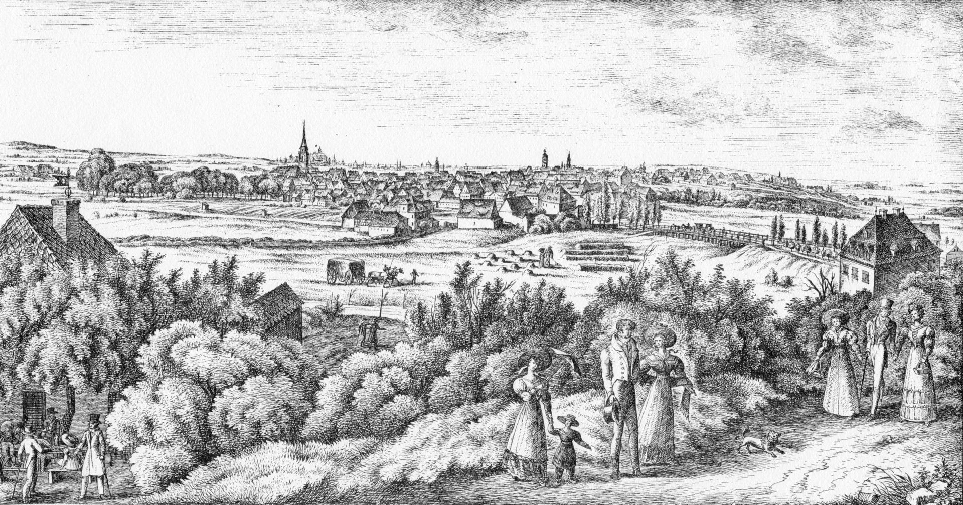 | Beschreibung | Stadtansicht von 1835, etwa vom heutigen Klinikum aus, links im Bild der Meierskeller und rechts die heutige Gaststätte Schlössla | ||