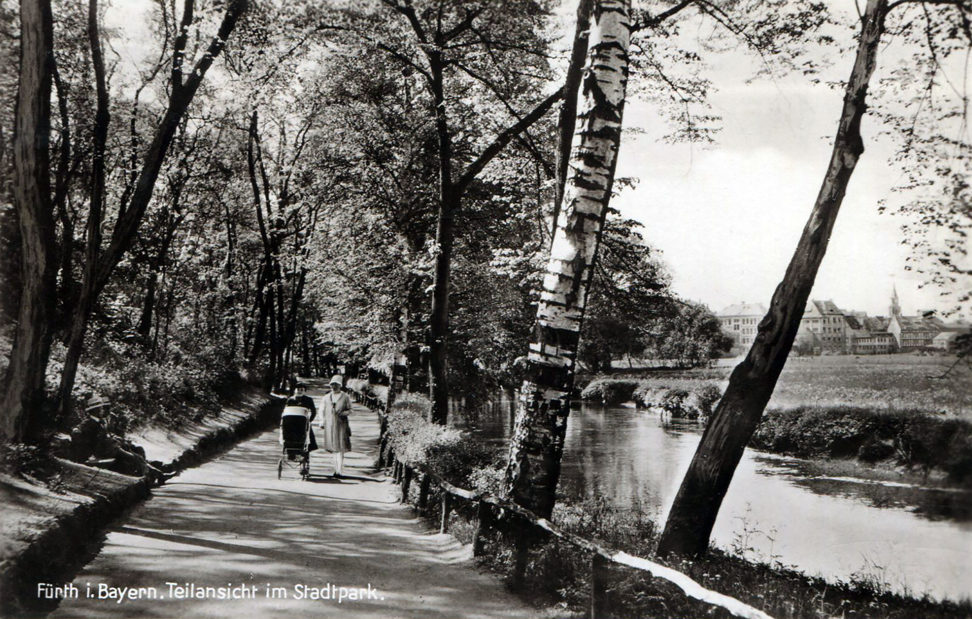 | Beschreibung | Postkarte aus dem Stadtpark, rechts im Bild die St. Michaelskirche und die Pegnitz, gel. 1937 | ||