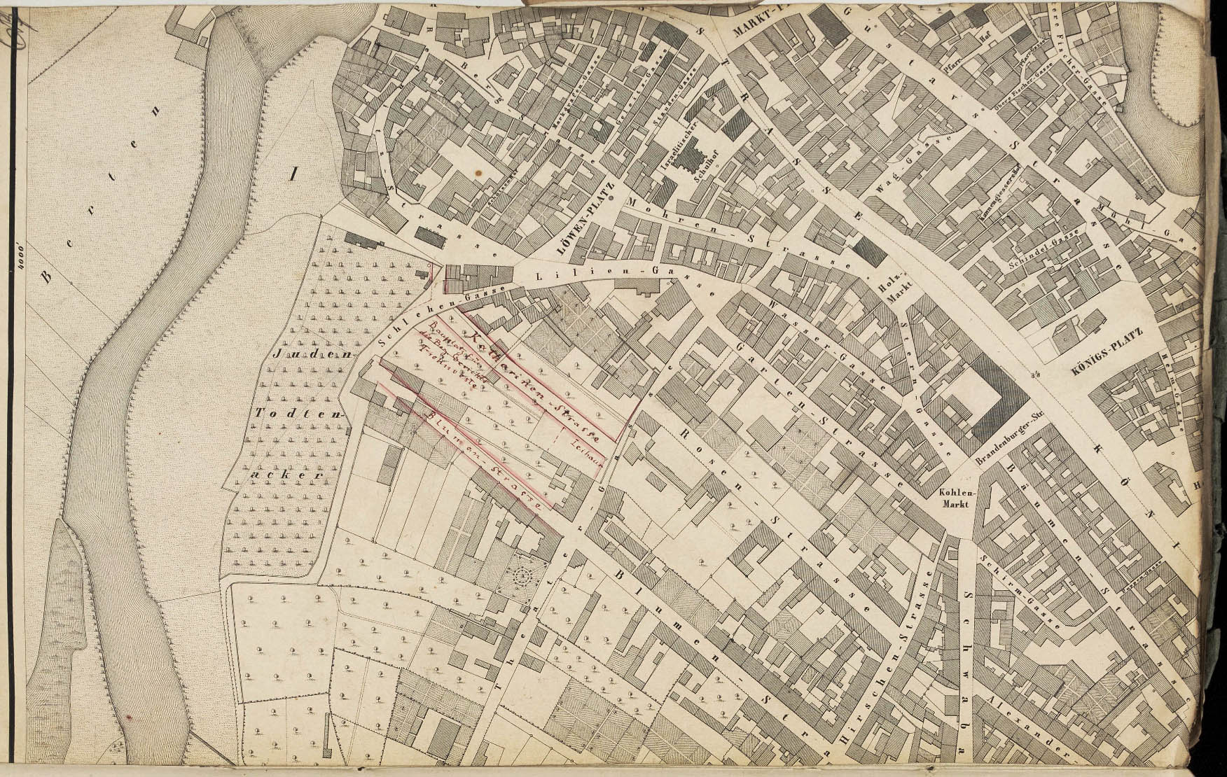 | Dateiinfo (Bild-Unterschrift und Info-Box, automatisch erstellt) | Stadtplan mit Lage des jüdischen Friedhofs und geplanter Fronfeste in der Katharinenstraße, 1869 Urheber: unbekannt<br><br>Lizenz: CC BY-SA 4.0 | ||