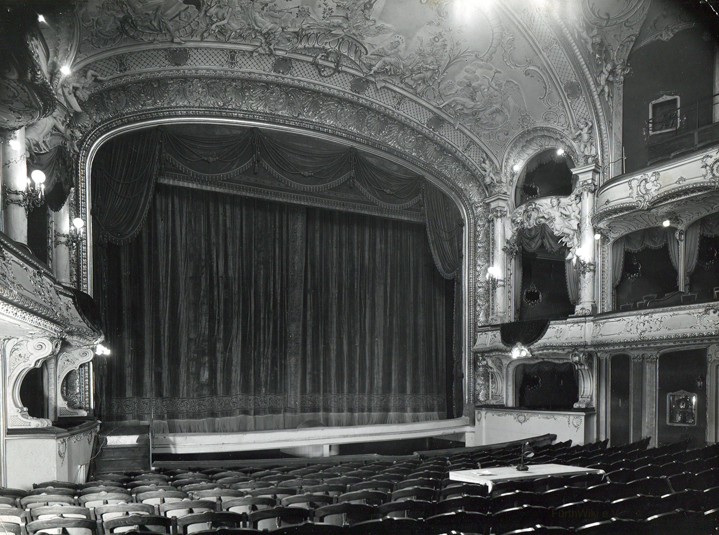 | Dateiinfo (Bild-Unterschrift und Info-Box, automatisch erstellt) | Stadttheater Fürth, Innenraum mit Bühne, 1937 Urheber: unbekannt<br><br>Lizenz: CC BY-SA 3.0 | ||