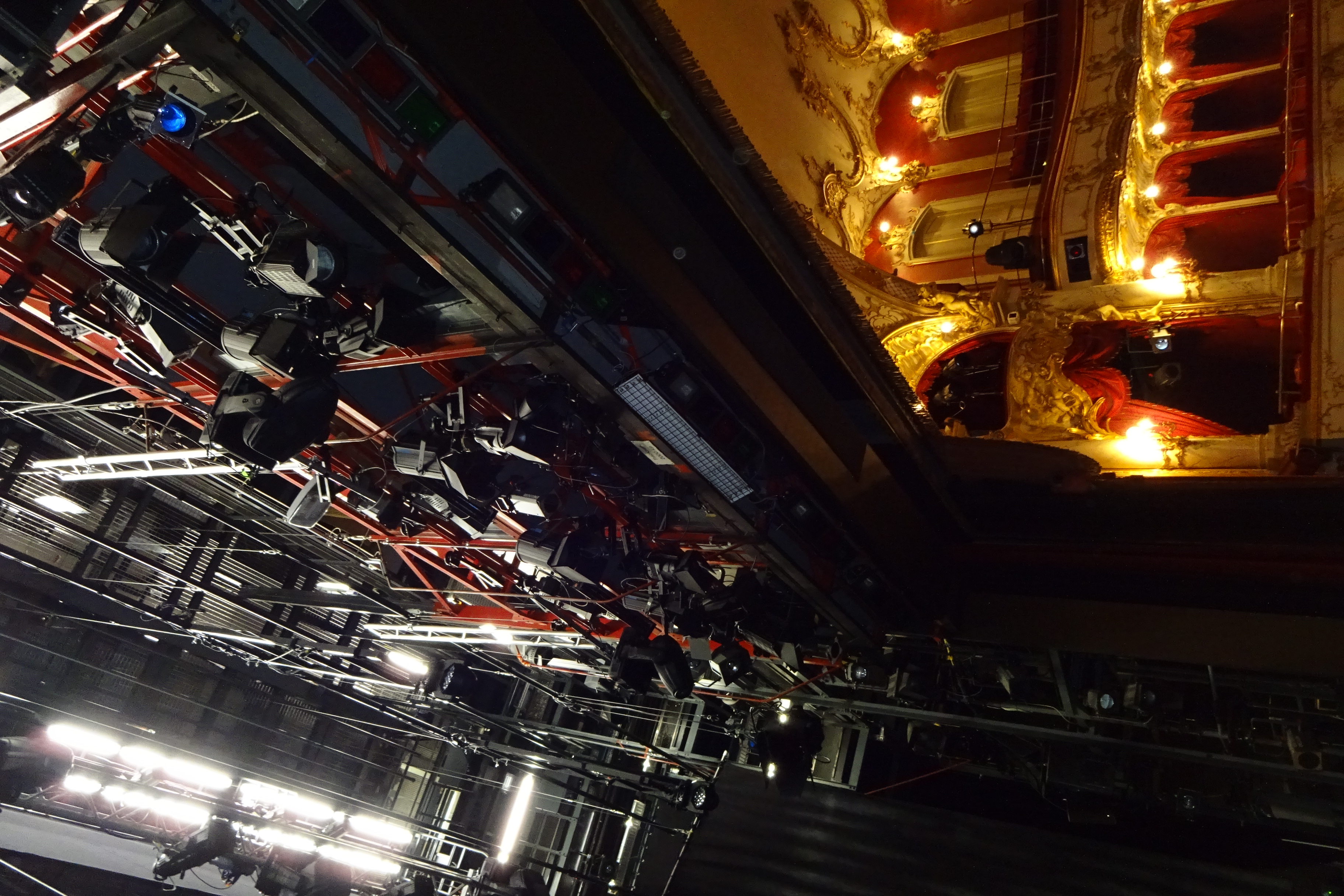 | Beschreibung | Blick hinter die "Kulissen" über das Bühnenportal in den Bühnenturm in die "Obermaschinerie" Technik mit Beleuchtungsbrücken, Laufgitter, Schnürboden usw. im März 2025 | ||