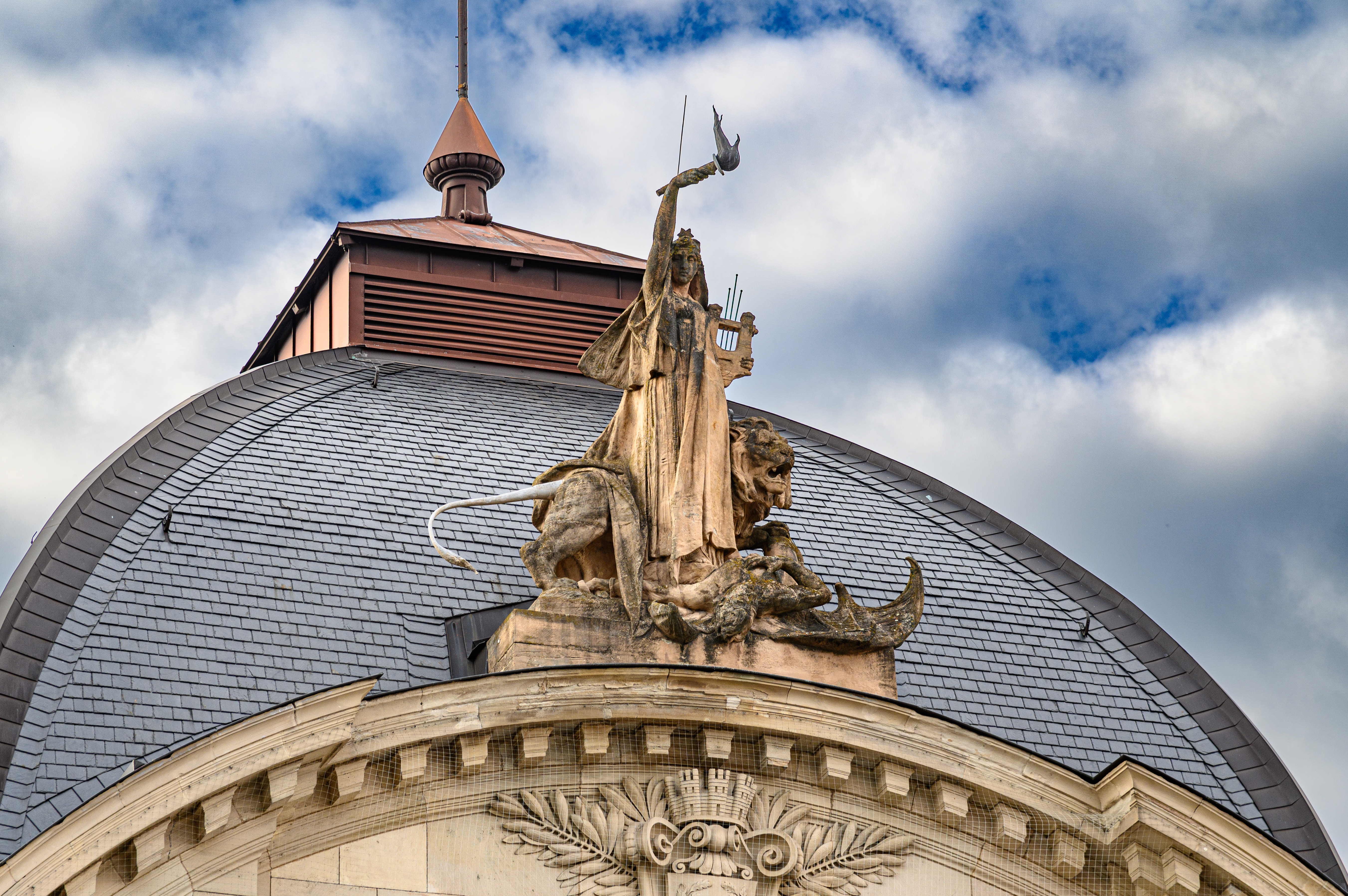 | Beschreibung | Frauenfigur mit Fackel und Löwe über dem Portal des Stadttheaters, 2023 | ||