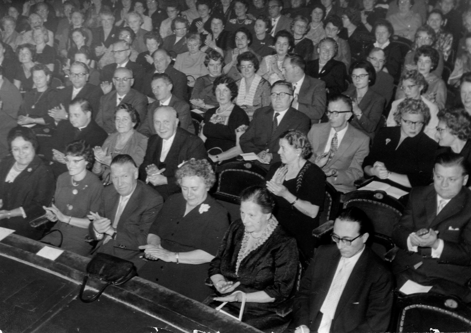 | Beschreibung | Veranstaltung im Stadttheater: 1. Reihe links Liesl Kießling, 1. Reihe dritter von links: Johann-Adam Segitz, ca. 1960 | ||
