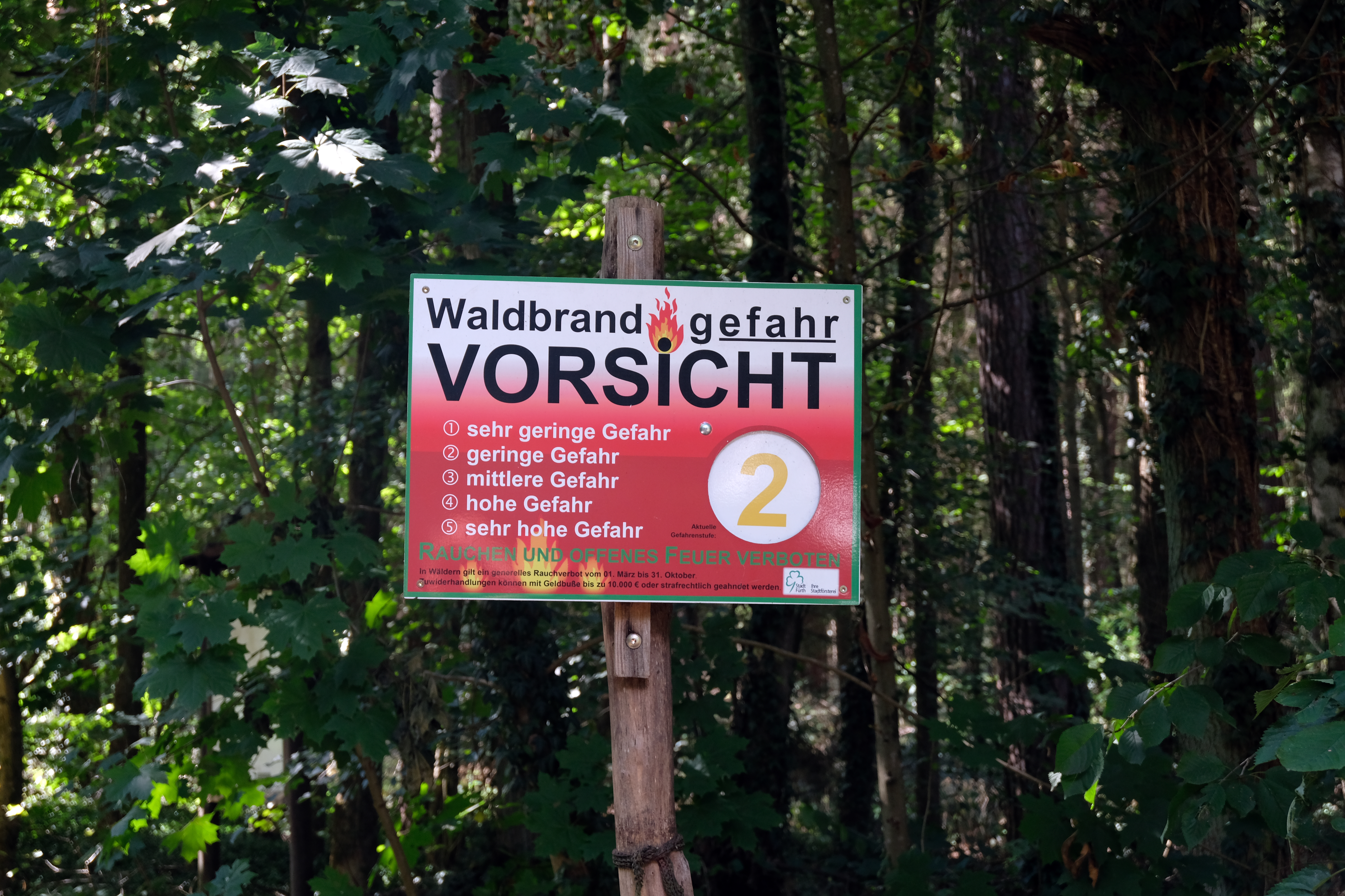 | Beschreibung | Hinweisschild über Waldbrandgefahr im Stadtwald bei Oberfürberg, Aug. 2020 | ||