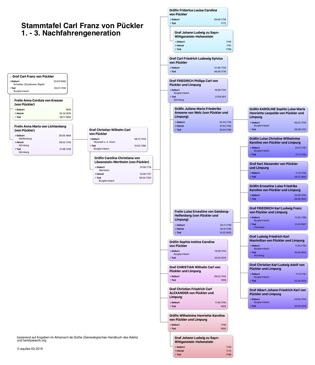 | Dateiinfo (Bild-Unterschrift und Info-Box, automatisch erstellt) | Stammtafel Graf Carl Franz von Pückler, 1. - 3. Nachfolgegeneration Urheber: aquilex<br><br>Lizenz: CC BY-SA 3.0 | ||
