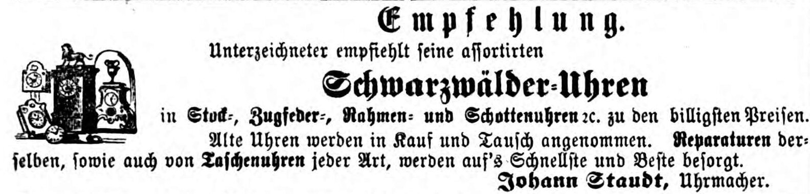 | Dateiinfo (Bild-Unterschrift und Info-Box, automatisch erstellt) | Werbeannonce des Uhrmachers Johann Staudt, August 1867 Lizenz: NoC-NC 1.0 | ||