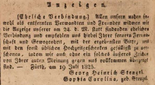 | Beschreibung | Heiratsanzeige von Georg Heinrich Stengel und Carolina Stengel, Juli 1825 | ||