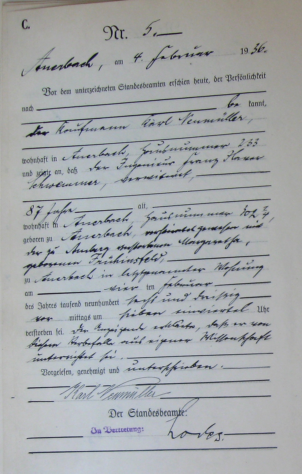 | Beschreibung | Sterbeeintrag Franz Xaver Schwemmer, Standesamt Auerbach/Opf. | ||