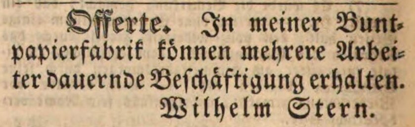 | Beschreibung | Zeitungsanzeige des Buntpapierfabrikanten Wilhelm Stern, Mai 1849 | ||