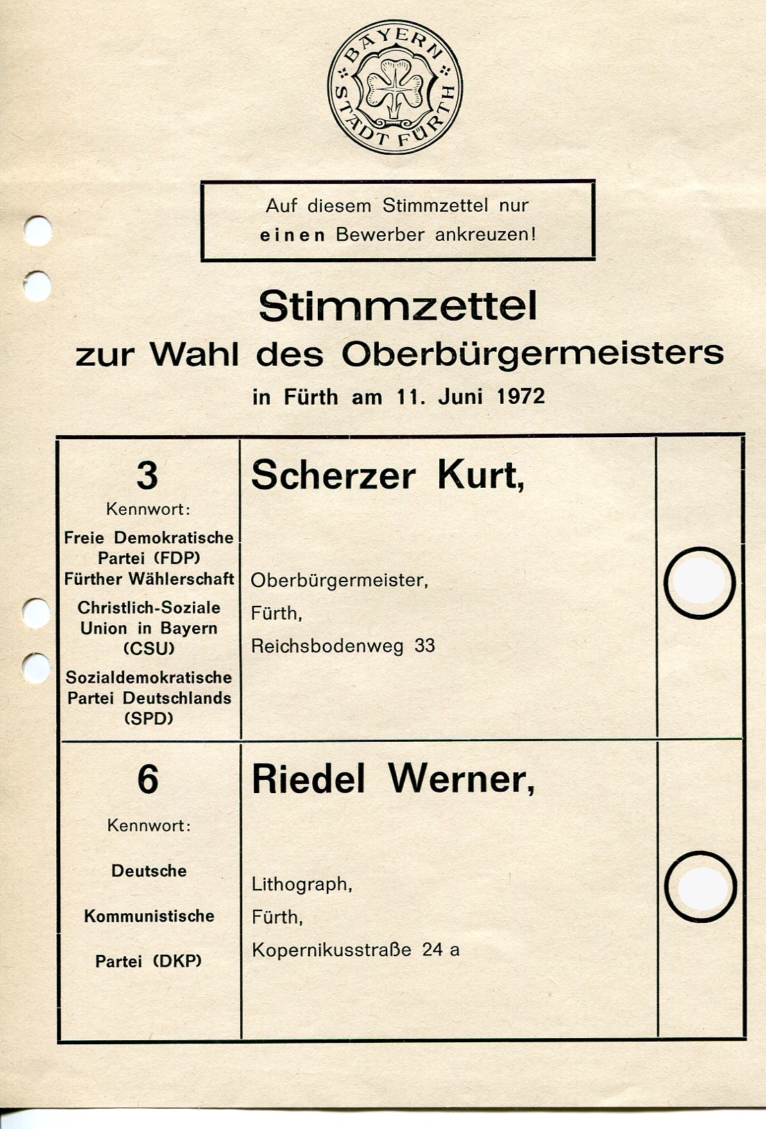 | Beschreibung | Stimmzettel der Oberbürgermeister Wahl vom 11.6.1972 zwischen Kurt Scherzer und Werner Riedel | ||