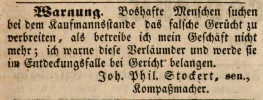 | Beschreibung | Zeitungsanzeige des Kompassmachers Joh. Phil. Stockert sen., Oktober 1849 | ||