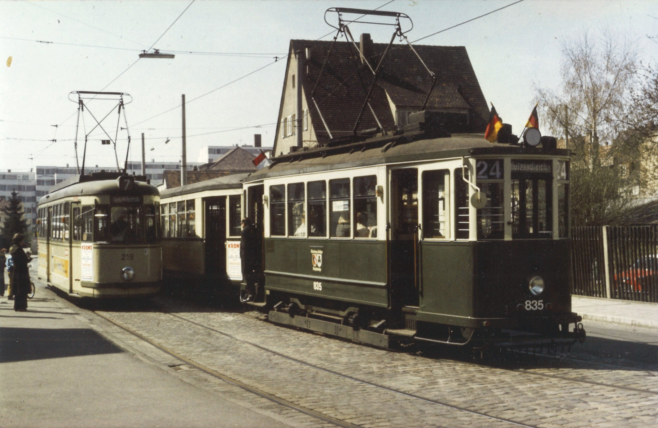 | Beschreibung | Blick in die Kiderlinstraße. Straßenbahnendhaltestelle Flößaustr. mit Triebwagen 218 und historischem Wagen 835. Im Hintergrund Wohnhaus Schwabacher Str. 195. Juni 1981. | ||
