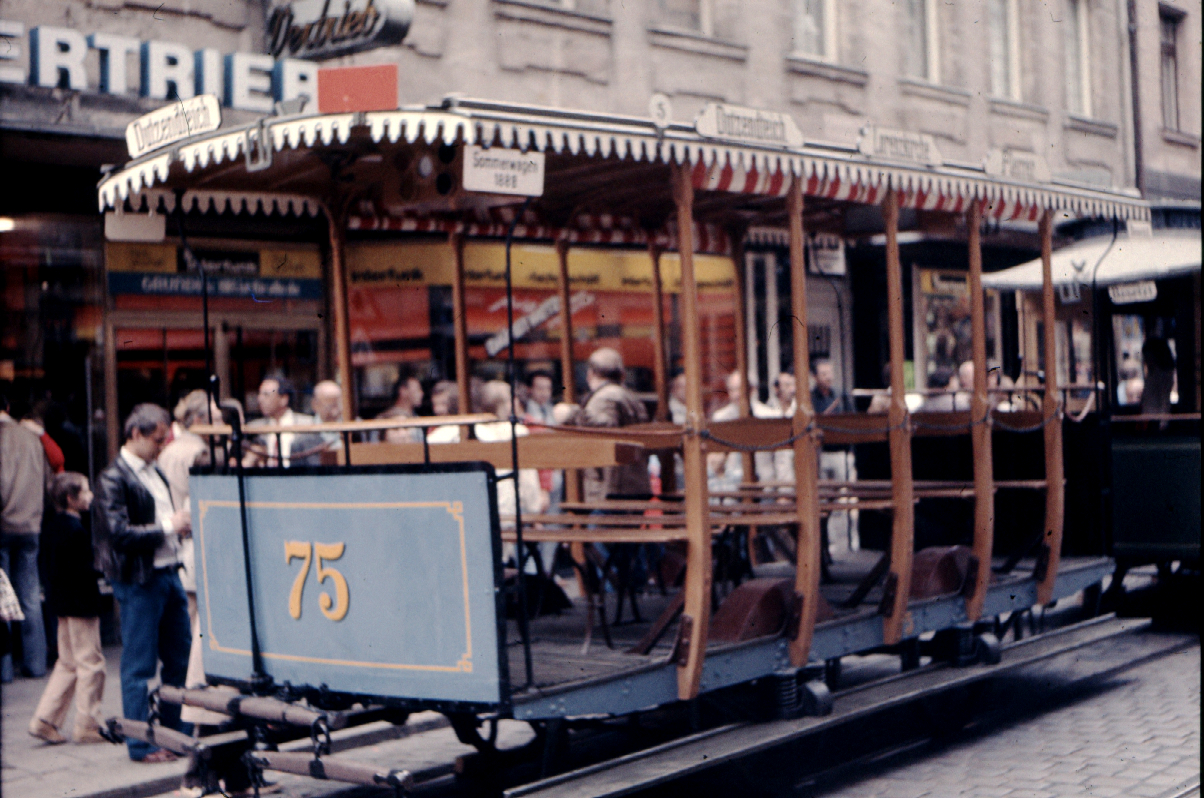 | Beschreibung | Fahrzeugschau der Nürnberg-Fürther Straßenbahn zum Abschied am 20. Juni 1981 in der Schwabacher Str. Pferdebahn-Sommerwagen 75 von 1888. | ||