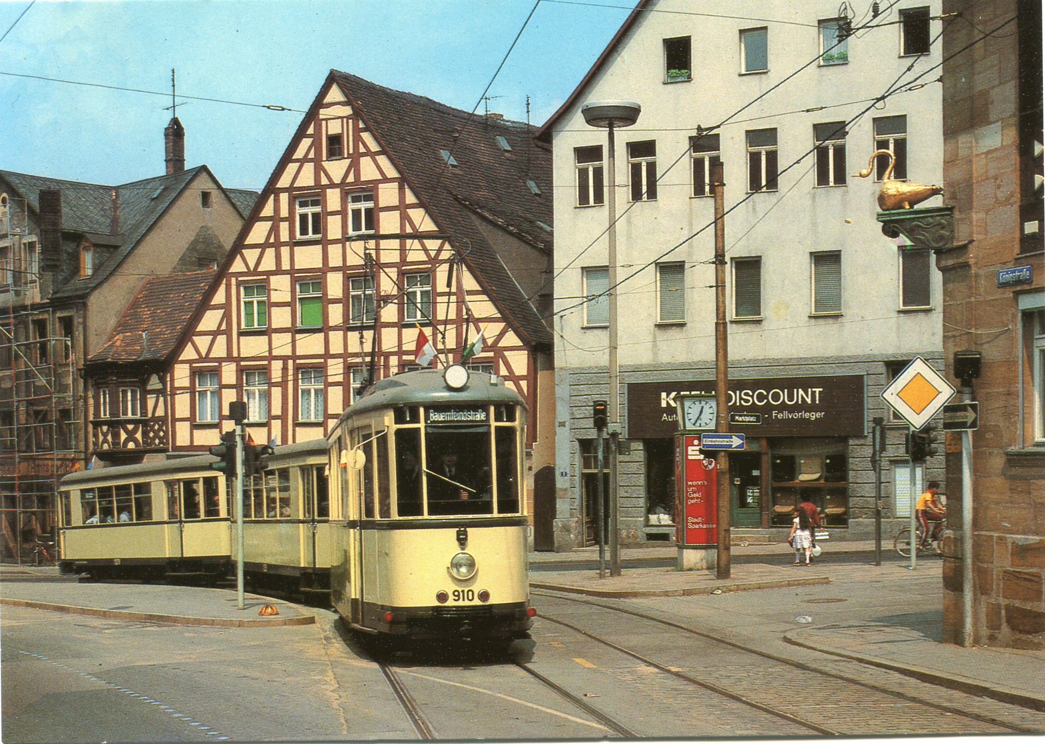 | Dateiinfo (Bild-Unterschrift und Info-Box, automatisch erstellt) | Postkarte mit Straßenbahn TW 910 Bj. 1940 an der Haltestelle Grüner Markt 1981 Urheber: Freunde der Nürnberg-Fürther Straßenbahn eV.<br><br>Lizenz: CC BY-SA 3.0 | ||