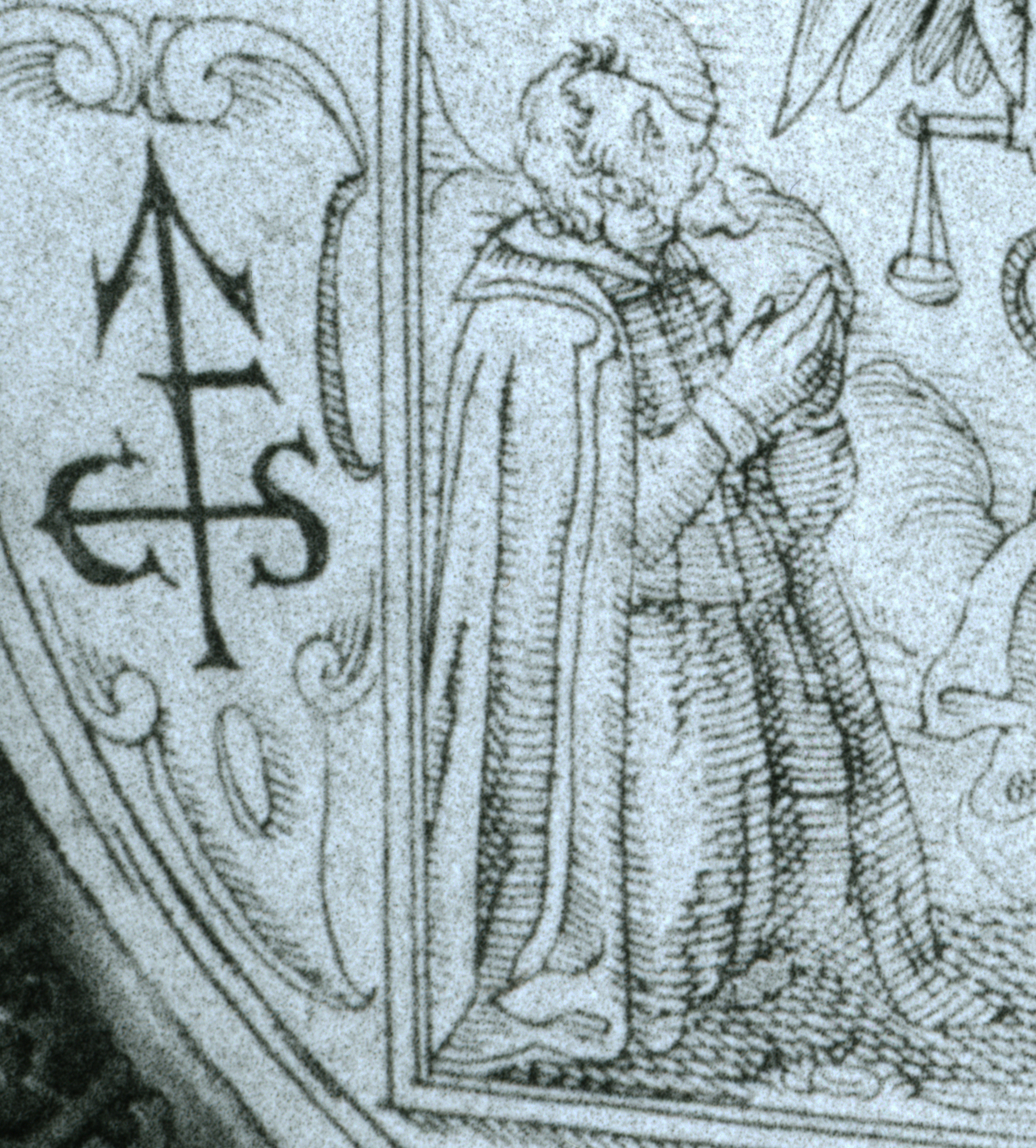 | Beschreibung | Selbstbildnis von Conrad Stutz auf der Gravurplatte des gestifteten Kelches von 1626; links daneben das Meisterzeichen: ein aufsteigender Pfeil mit aufgelegtem "F" (für Fürth) an dessen Mittelstrich die Buchstaben "C" und "S" (für Conrad Stutz) | ||