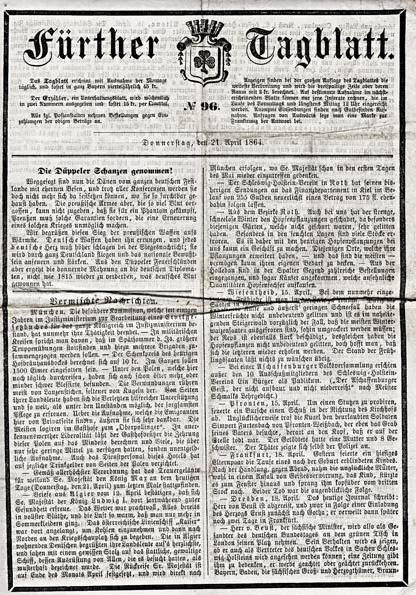 | Dateiinfo (Bild-Unterschrift und Info-Box, automatisch erstellt) | Ausgabe des Fürther Tagblatts vom 24. April 1864 Lizenz: CC BY-SA 3.0 | ||