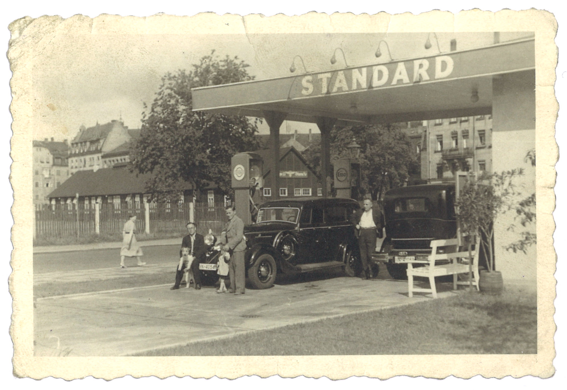 | Beschreibung | neu erbaute Tankstelle der Familie Miederer, Waldstr. 31 (damals 33). Links der Chrysler des Tankstellenbesitzers, rechts ein Mercedes Nürburg, welcher vermietet wurde, z. B. an die Firma J. W. Spear & Söhne. Im Hintergrund die NSFK-Baracke und Häuser an der Flößaustraße. Aufnahme 1939 | ||