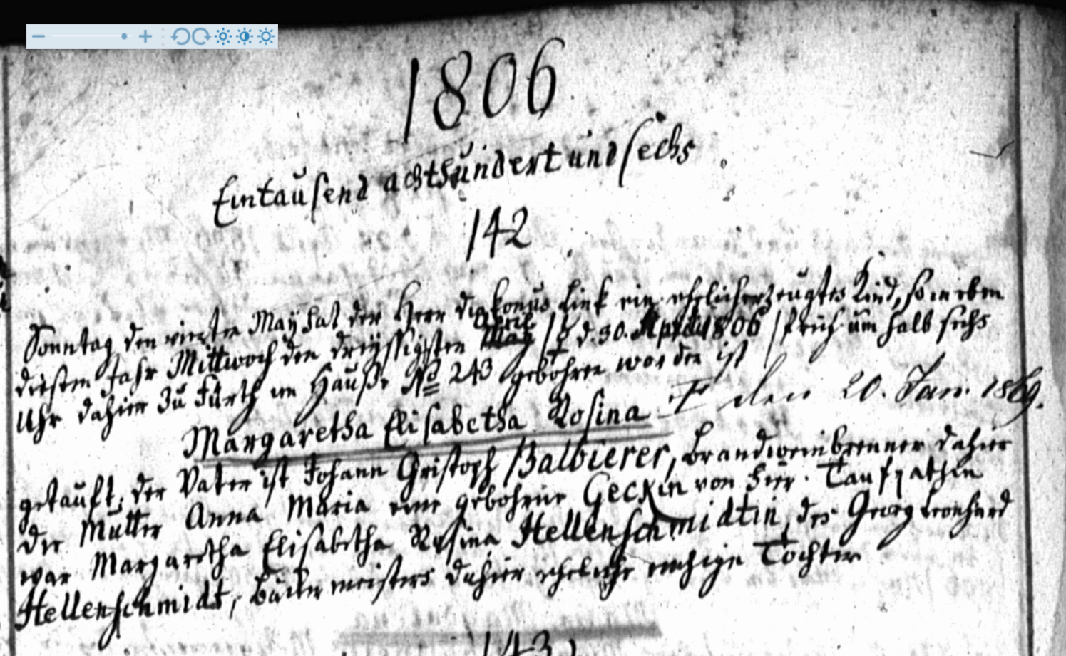 | Beschreibung | Taufeintrag Margaretha Elisabetha Rosina Balbierer, Taufbuch 1806, Kirche St. Michael | ||