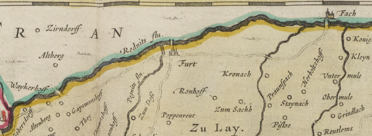 | Quellangaben | Blaeu Atlas Maior 1662-5, Volume 3 "Territorivm Norimbergense". Von: National Library of Scotland online-Digitalisat | ||