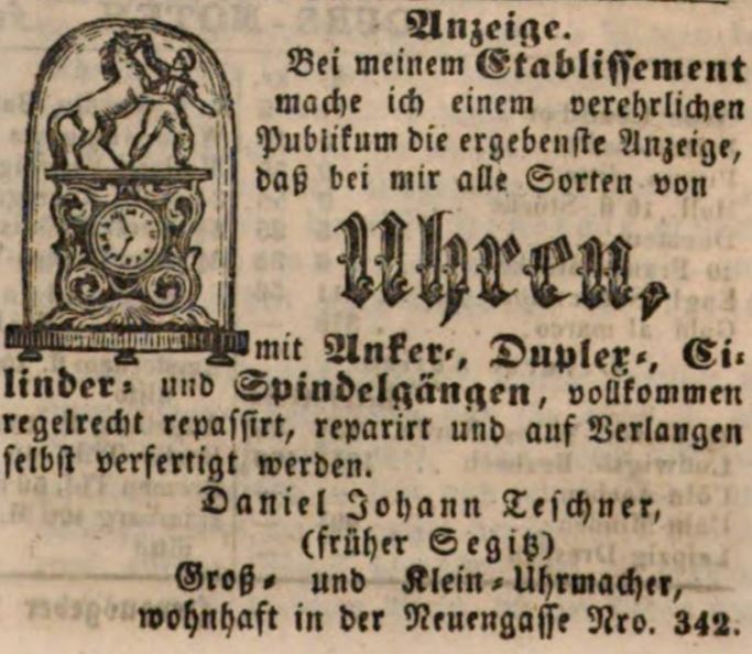 | Dateiinfo (Bild-Unterschrift und Info-Box, automatisch erstellt) | Zeitungsannonce des Uhrmachers Daniel Johann Teschner in der "Neuengasse", Juni 1846 | ||
