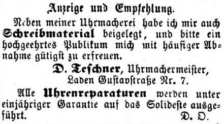 | Dateiinfo (Bild-Unterschrift und Info-Box, automatisch erstellt) | Zeitungsanzeige des Uhrmachers Daniel Teschner, Mai 1868 Lizenz: NoC-NC 1.0 | ||