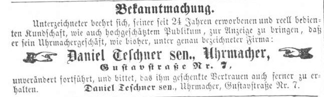 | Beschreibung | Zeitungsanzeige des Uhrmachers Daniel Teschner sen., September 1870 | ||