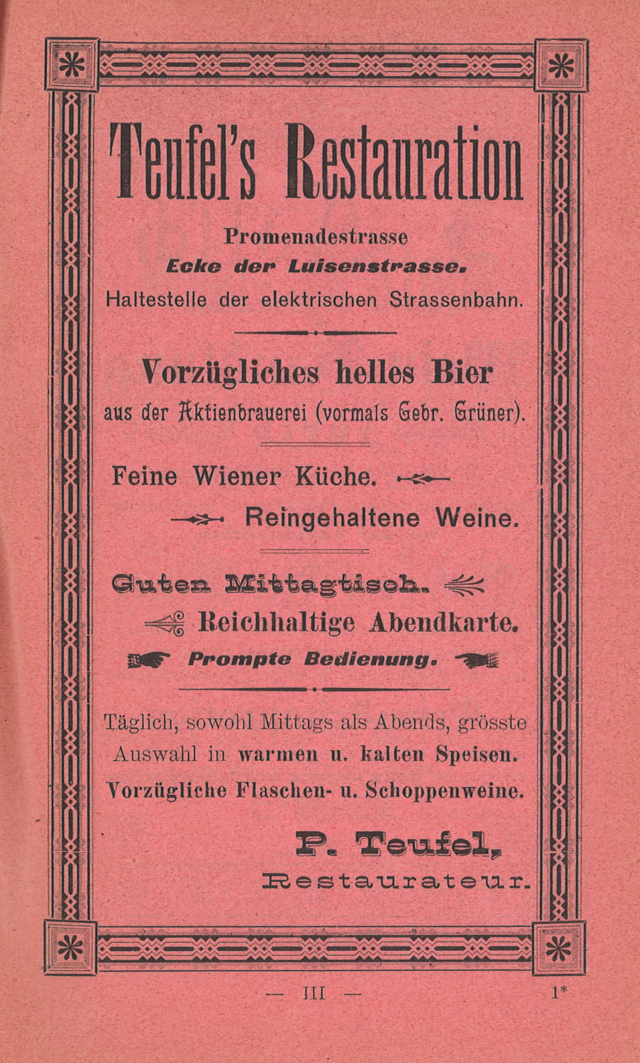 | Dateiinfo (Bild-Unterschrift und Info-Box, automatisch erstellt) | Teufel's Restauration, ehemals Luisenstr. 3, Werbeanzeige von 1898 Lizenz: CC BY-SA 3.0 | ||