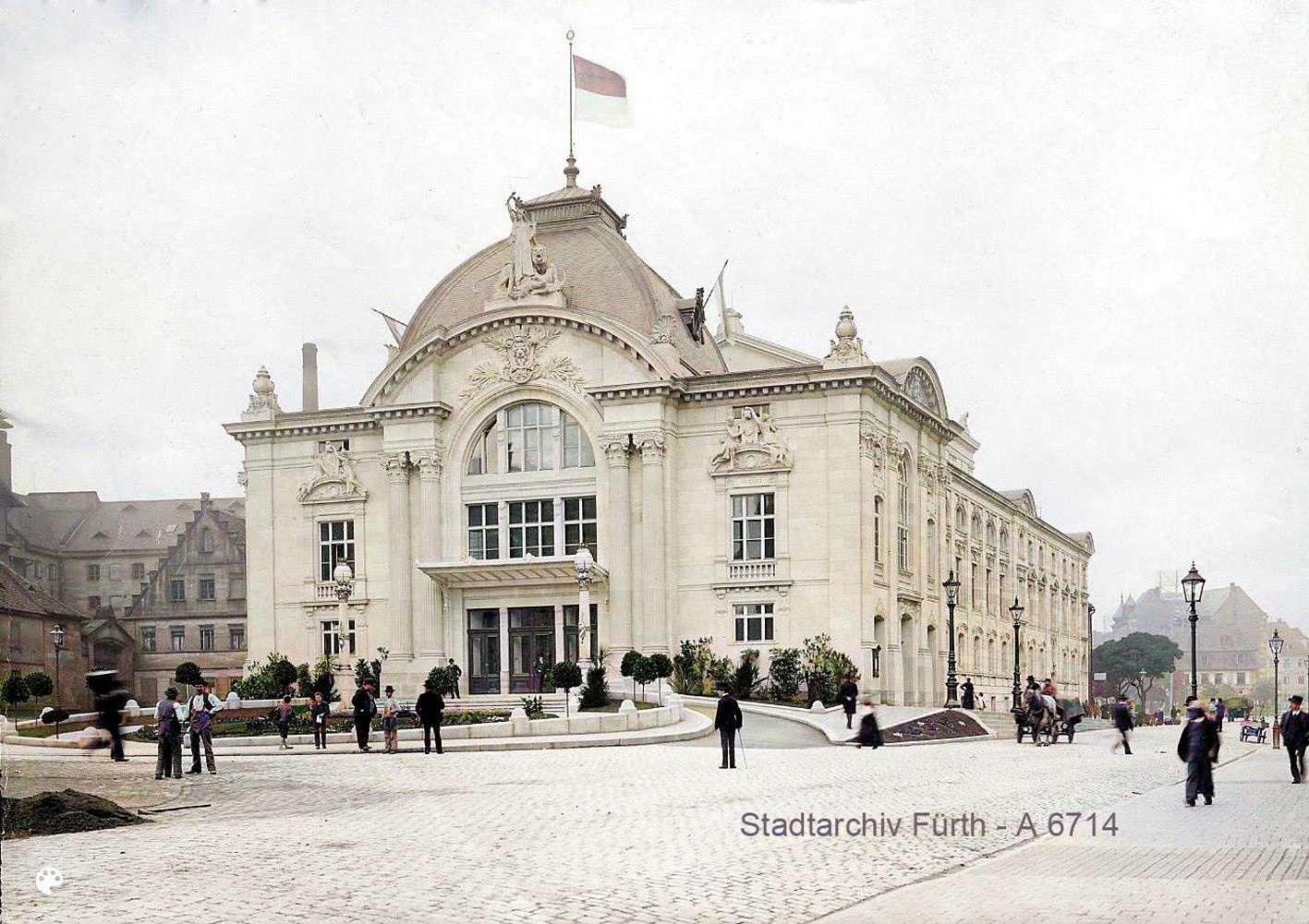 | Beschreibung | Das Stadttheater auf einer alten Photographie noch mit Rondell, links daneben die Brauerei Geismann (Kolorierung mit MyHeritage in Color (tm)) | ||